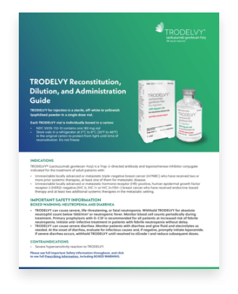 References: 1. TRODELVY. Prescribing Information. Gilead Sciences, Inc.; March 2025. 2. Referenced with permission from the NCCN Clinical Practice Guidelines in Oncology (NCCN Guidelines®) for Hematopoietic Growth Factors V.1.2025. ©National Comprehensive Cancer Network, Inc. 2024. All rights reserved. Accessed April 17, 2025. To view the most recent and complete version of this guideline, go online to NCCN.org.