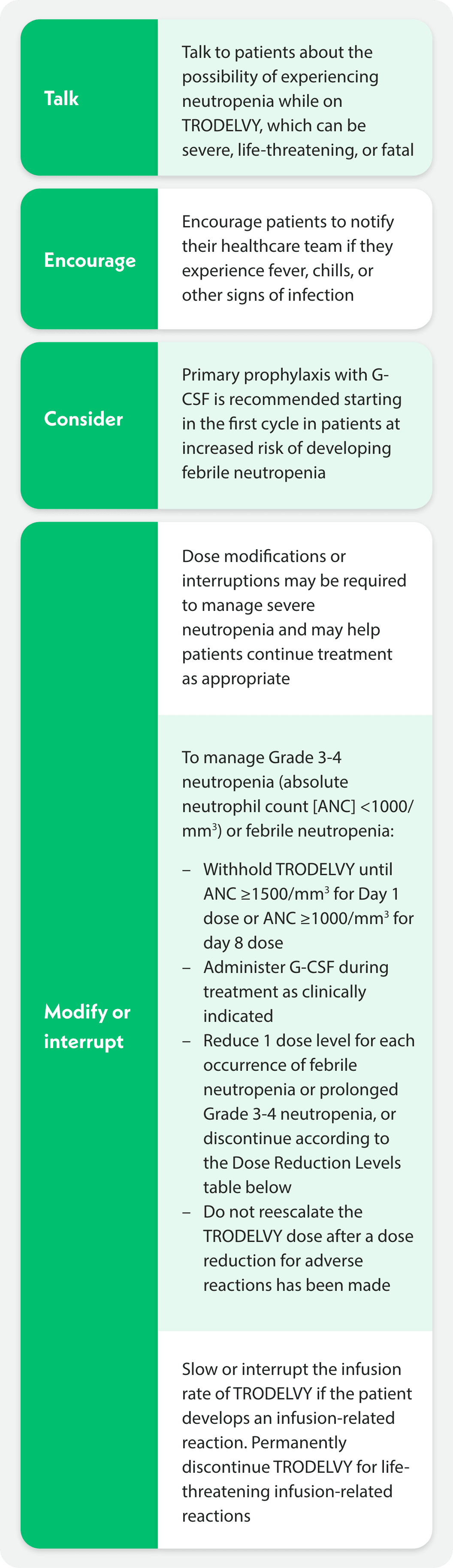Neutropenia: Severe, life-threatening, or fatal neutropenia can occur as early as the first cycle of treatment and may require dose modification. Neutropenia occurred in 64% of patients treated with TRODELVY. Grade 3-4 neutropenia occurred in 49% of patients. Febrile neutropenia occurred in 6%. Neutropenic colitis occurred in 1.4%. Primary prophylaxis with G-CSF is recommended starting in the first cycle of treatment in all patients at increased risk of febrile neutropenia, including older patients, patients with previous neutropenia, poor performance status, organ dysfunction, or multiple comorbidities. Monitor absolute neutrophil count (ANC) during treatment. Withhold TRODELVY for ANC below 1500/mm3 on Day 1 of any cycle or neutrophil count below 1000/mm3 on Day 8 of any cycle. Withhold TRODELVY for neutropenic fever. Treat neutropenia with G-CSF and administer prophylaxis in subsequent cycles as clinically indicated or indicated in Table 2 of USPI.