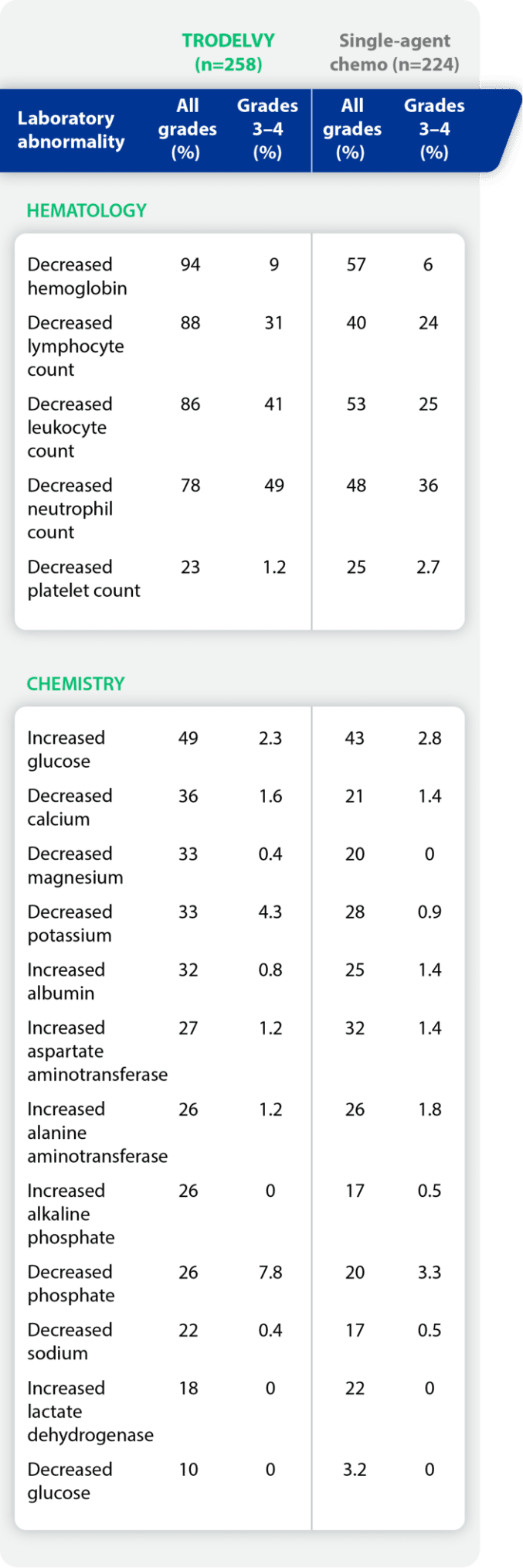 In the pooled safety population, the most common (≥25%) adverse reactions including laboratory abnormalities were decreased leukocyte count (84%), decreased neutrophil count (75%), decreased hemoglobin (69%), diarrhea (64%), nausea (64%), decreased lymphocyte count (63%), fatigue (51%), alopecia (45%), constipation (37%), increased glucose (37%), decreased albumin (35%), vomiting (35%), decreased appetite (30%), decreased creatinine clearance (28%), increased alkaline phosphatase (28%), decreased magnesium (27%), decreased potassium (26%), and decreased sodium (26%).