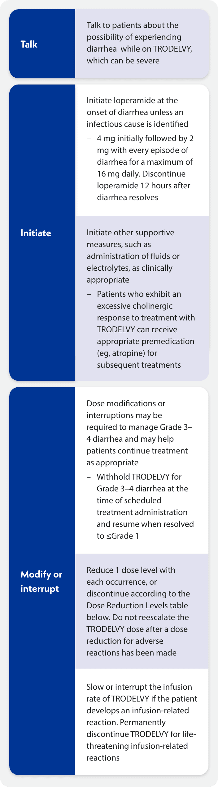 - TRODELVY can cause severe diarrhea. Monitor patients with diarrhea and give fluid and electrolytes as needed. At the onset of diarrhea, evaluate for infectious causes and, if negative, promptly initiate loperamide. If severe diarrhea occurs, withhold TRODELVY until resolved to ≤Grade 1 and reduce subsequent doses.