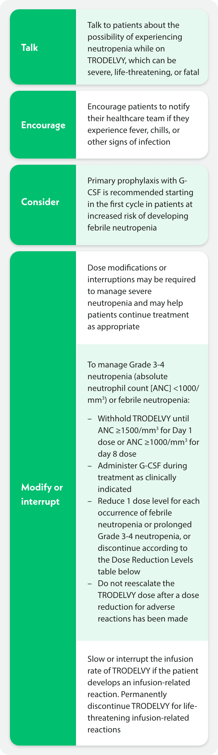 Neutropenia: Severe, life-threatening, or fatal neutropenia can occur as early as the first cycle of treatment and may require dose modification. Neutropenia occurred in 64% of patients treated with TRODELVY. Grade 3-4 neutropenia occurred in 49% of patients. Febrile neutropenia occurred in 6%. Neutropenic colitis occurred in 1.4%. Primary prophylaxis with G-CSF is recommended starting in the first cycle of treatment in all patients at increased risk of febrile neutropenia, including older patients, patients with previous neutropenia, poor performance status, organ dysfunction, or multiple comorbidities. Monitor absolute neutrophil count (ANC) during treatment. Withhold TRODELVY for ANC below 1500/mm3 on Day 1 of any cycle or below 1000/mm3 on Day 8 of any cycle. Withhold TRODELVY for neutropenic fever. Treat neutropenia with G-CSF and administer prophylaxis in subsequent cycles as clinically indicated or indicated in Table 2 of USPI.